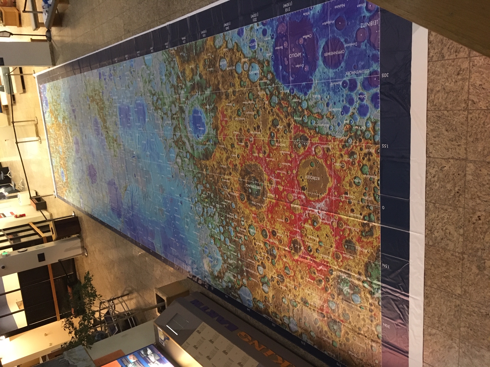 This vinyl map can only be walked on in socks, so please be prepared to kick your shoes off for a lunar stroll. Sorry; no strollers, wheelchairs, or service animals are allowed on the map. It's perfectly fine to stand at the edge and look across.