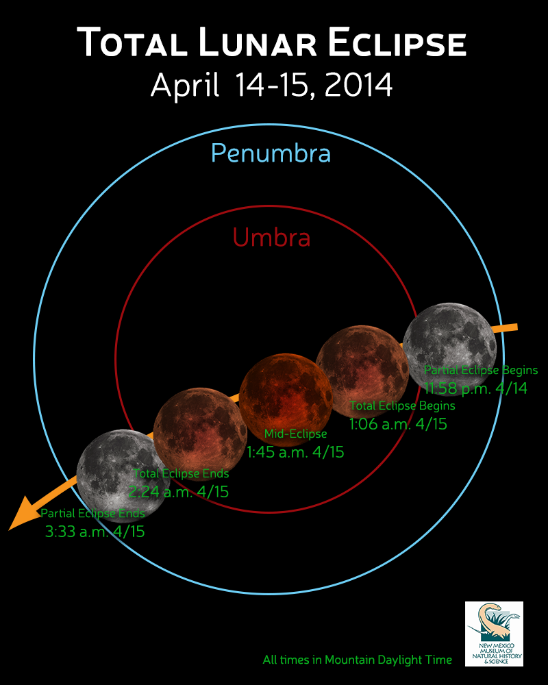 A total eclipse of the moon will be visible over all of North America, starting on the evening of Monday, April 14 and continuing into the morning of April 15. This is the first total lunar eclipse visible from New Mexico since 2011 and The Museum of Natural History and Science Planetarium is proud to host an event called “Mega Moon and Mars Night” starting on April 14 at 10 p.m. and ending at 2 a.m. on April 15.