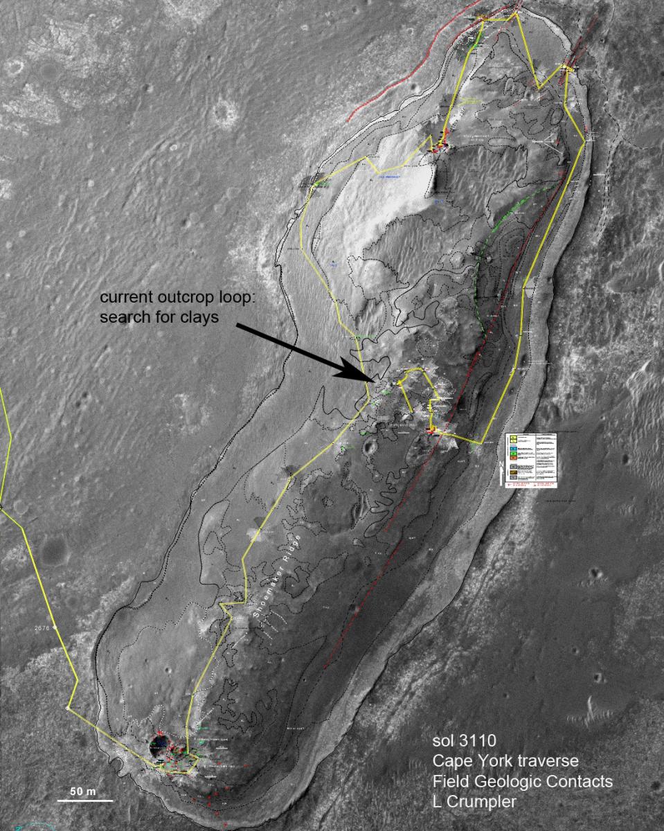 We have been exploring along the margins of Cape York since sol 2681. This map shows the traverse north and around the north top of Cape York, and the drive south along the east side. About half-way down the side we directed Opportunity into the interior in search of outcrops of clay minerals.