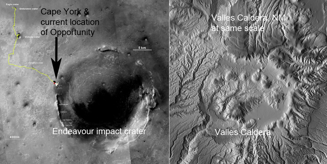 Opportunity is currently exploring a small ridge, Cape York, that is a remnant of a large impact crater dating from early Mars geologic history. The crater (Endeavour crater) is about the size of New Mexico's Valles caldera