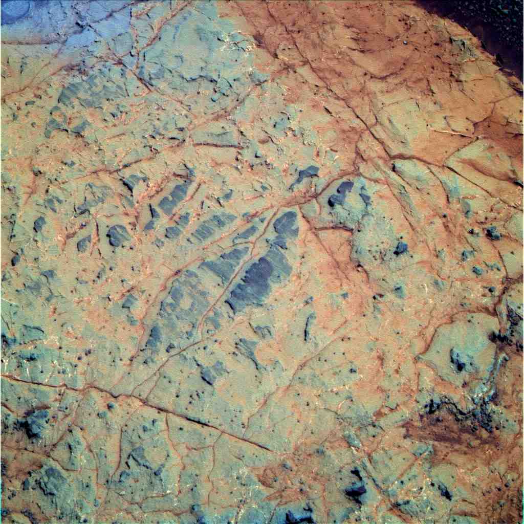 Pancam looking down on the target "Ortiz" that we are analyzing on this outcrop. Note all the small veins