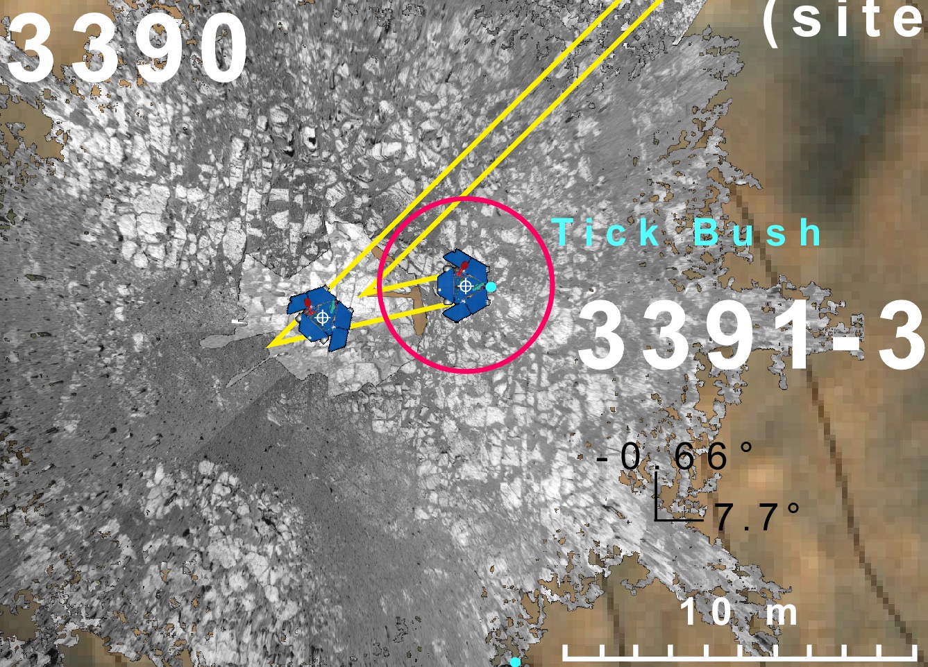 This view from the Panoramic camera ("Pancam") showsOpportunity's current location just off the contact with Solander Point. There is a peculiar escarpment at the base and some unusual big dark rocks laying around the contact. Most of the big rocks appear to be coming down slope from a big cluster that you can see up on the side of the hill. Several of the rocks have rolled across the contact and onto the sandstone that surrounds the Endeavour rim segments.This view was acquired by the Pancam on sol 3383 as Opportunity was doing the final drives towards the base of Solander Point. Opportunity has since driven to a small rock indicated by the arrow. It is probably not important in the "big picture", but we may see this type of rock again up on the ridge (where we need to be by December), so we felt it was useful to know if these rocks are differnt and, if so, how so. It turns out that they are compositionally different from any rocks previously seen by Opportunity, although not too different from rocks examined by Spirit.