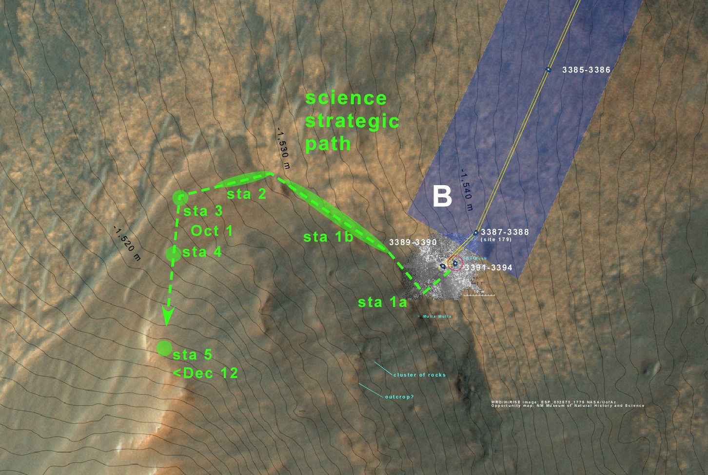 In order to check out one of these rocks, Opportunity did a short five meter drive to get one within the “work volume” of the IDD. This is the overhead projection of several Navcam mosaics. The surrounding rock with the polygonal fractures are the sandstones of the Meridiani Plains. The blue dot shows the location of one of the anomalous dark rocks that we are currently checking out.This will only take a day or two. Then Opportunity will get going northwest, “sail” along the scarp here at the base of the mountain, and end up at the northern point where we hope to make “landfall” on Solander Point.