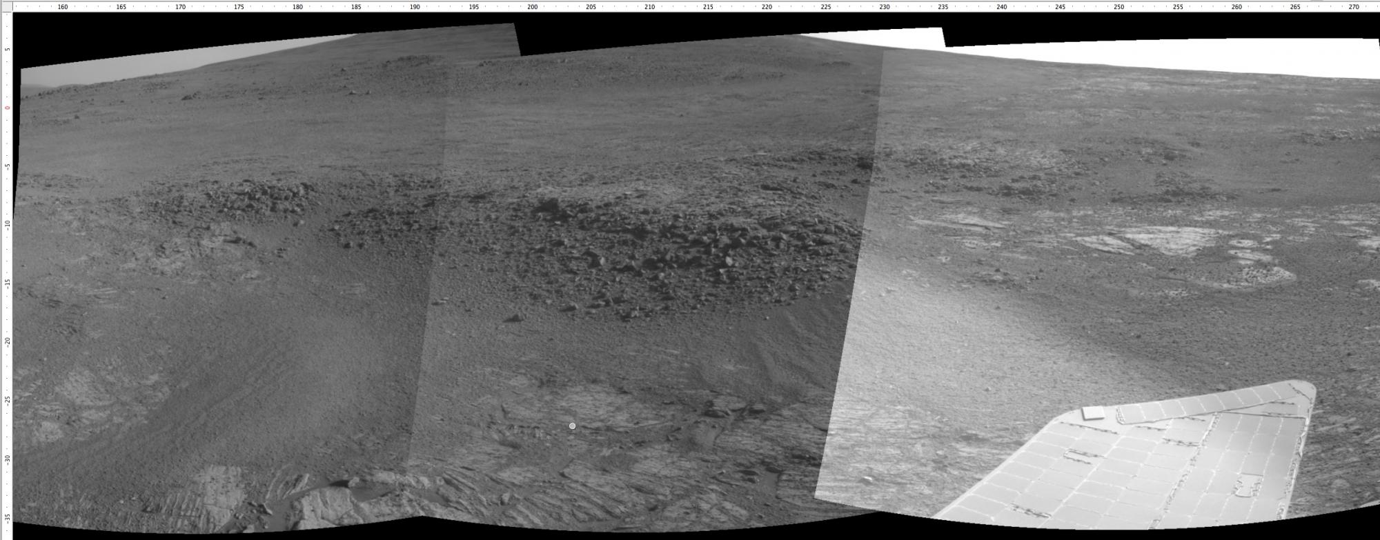 This morning we arrived at that outcrop where Opportunity will spent the weekend doing detailed analysis before moving on. Current the solar power is getting less as late fall approaches on Mars. So Opportunity needs to start the climb along the ridge of Solander Point where the northerly slopes will yield more power and science activities may continue I the coming months.