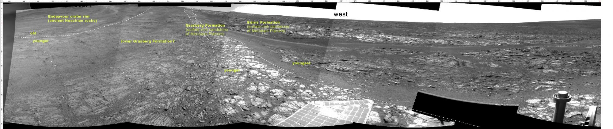 On sol 3425 Opportunity "waded ashore" at Solander Point after crossing a sea of sand between here and Cape York. Cape York was an "island" remnant of the rim of Endeavour crater that Opportunity left back in May. Since then it has been driving south to the next largest and mountainous remnant of the crater rim, Solander Point. The sand surrounds the isolated remnants of the rim of Endeavour crater and both Cape York and Solander Point are small exposures of very ancient terrain nearly engulfed by the later sands of Merdiani Planum.