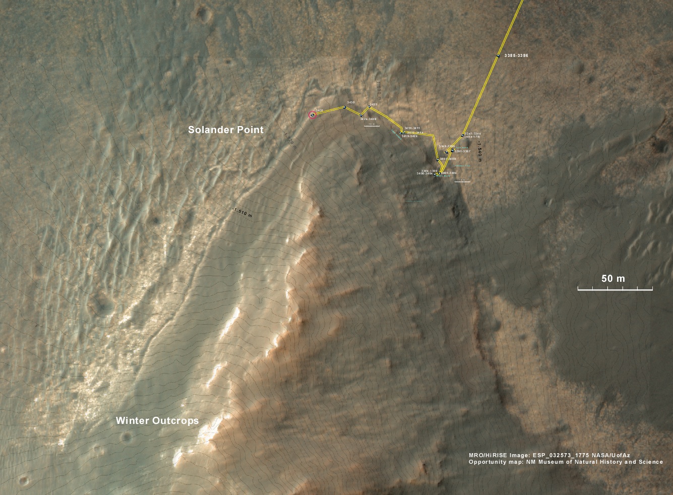 Above is the corresponding ovehead view using the Mars Reconnaissance Orbiter HiRISE camera view as a base. You can see how Opportunity has spent the last couple of sols walking across the very northernmost tip of Solander Point.