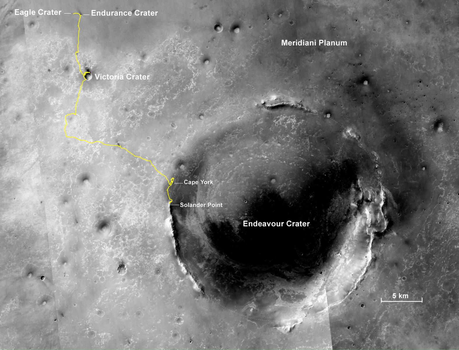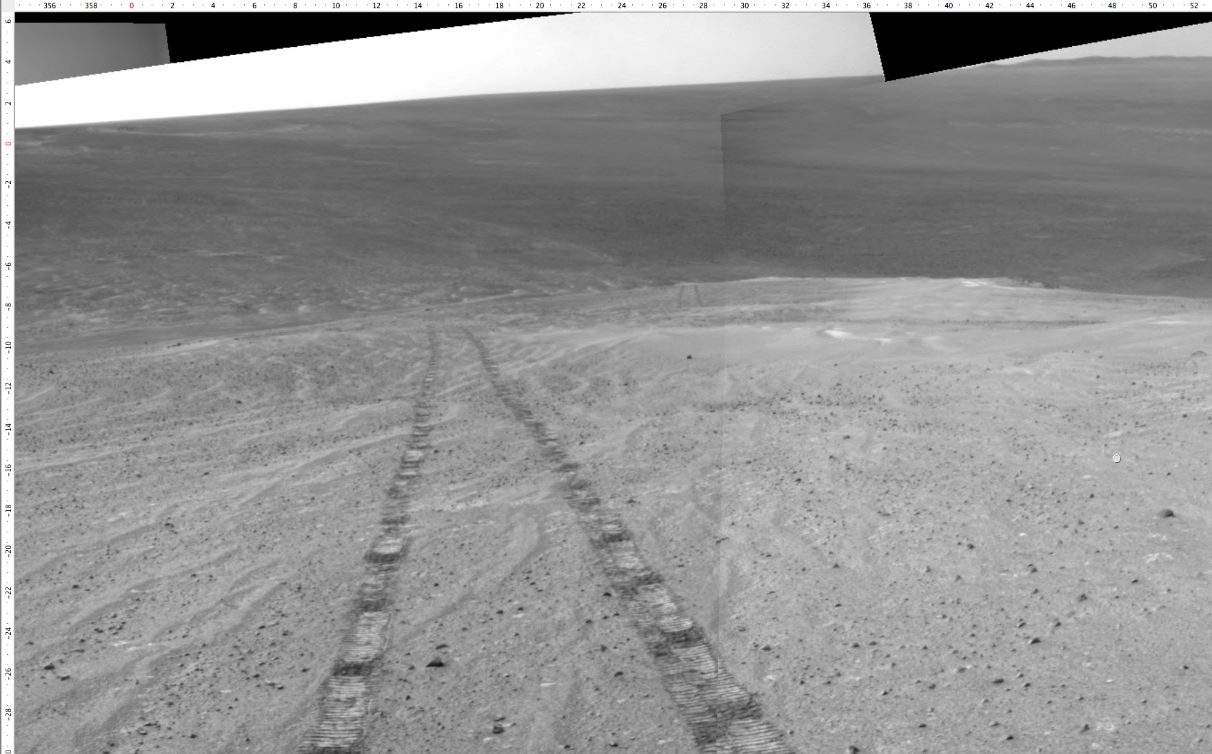 This is the view looking back at our tracks as of a few sols ago. Note that the tracks appear over multiple rises as they dwindle into the distance down slope. That is the floor of Endeavour crater over on the right. On the left distance you can just make out Cape York and Nobby Head where Opportunity just spent some time before driving south to Solander Point.