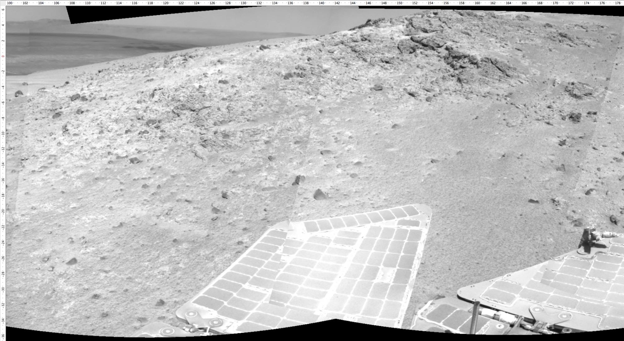 Above is the full 38.5 kilometers of traverse so far. You can see how we are moving south along the west rim of the ancient impact crater “Endeavour”. The segment of the rim we are climbing right now is “Solander Point”.