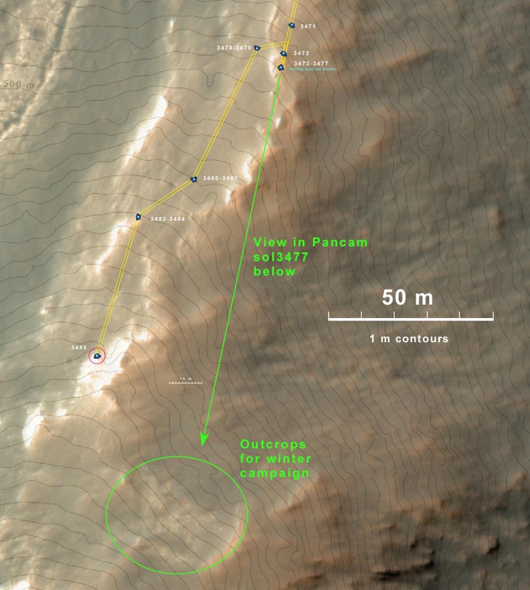 This is a look at the MRO/HiRISE orbital view of the last few drives along the ridge of Solander Point. The contours are 1m. We hope to move south for the winter to the area of outcrops indicated.