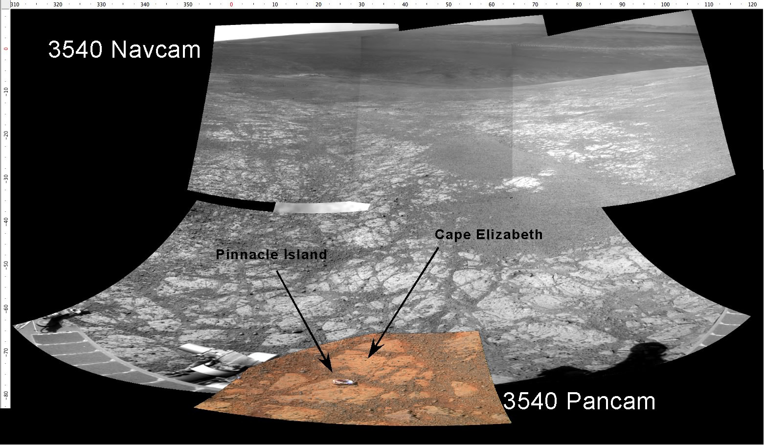 The outcrop in front of Opportunity on this sol. The odd rock discussed below is identified as "Pinnacle Island" in this composite Pancam color and grey Navcam image taken after the drive on sol 3540. The viw is toward the east across the floor to the far rim of Endeavour crater 22 km away.