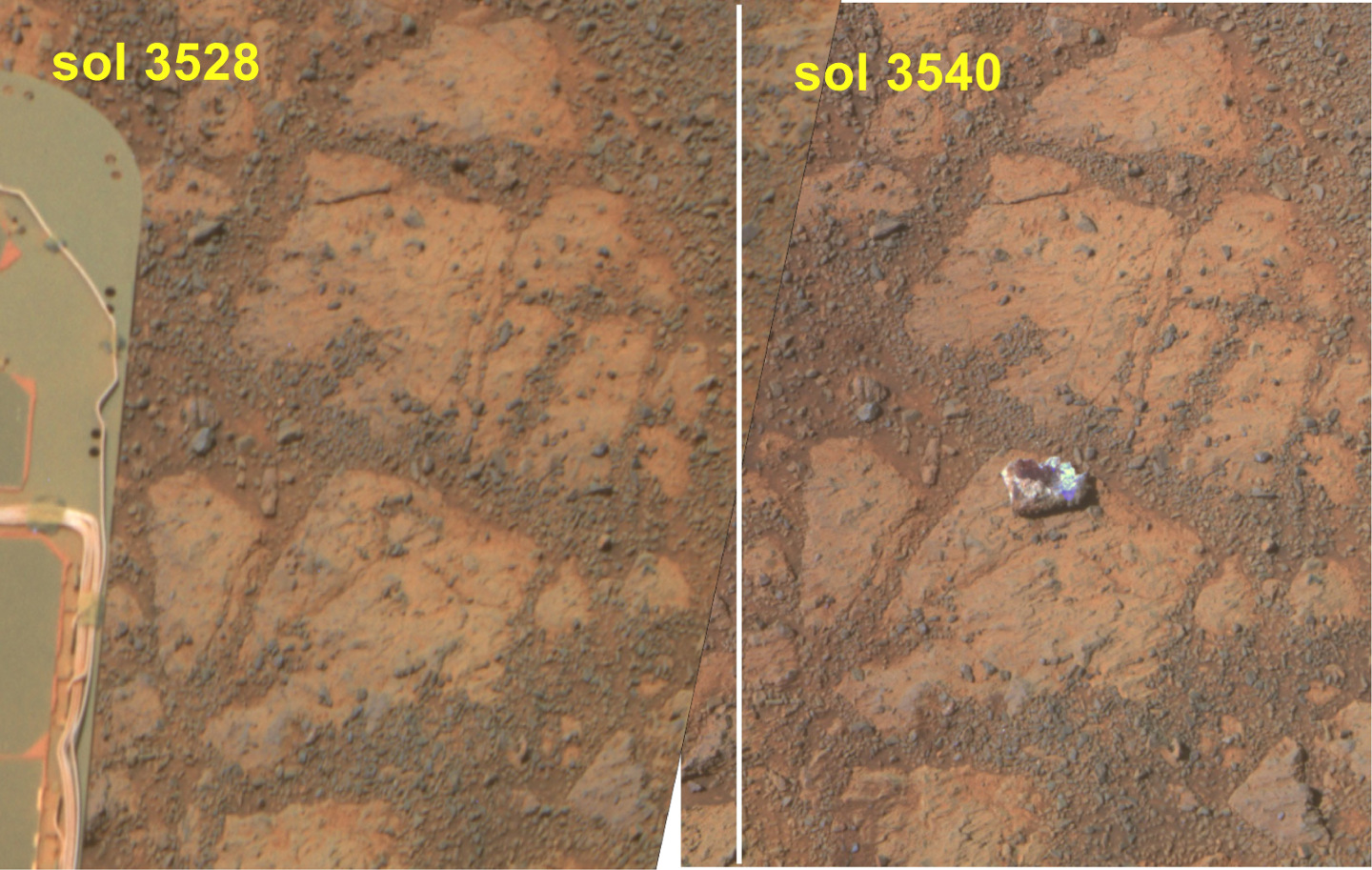 Comparison of a sol 3628 view and a sol 3540 view of the same spot.