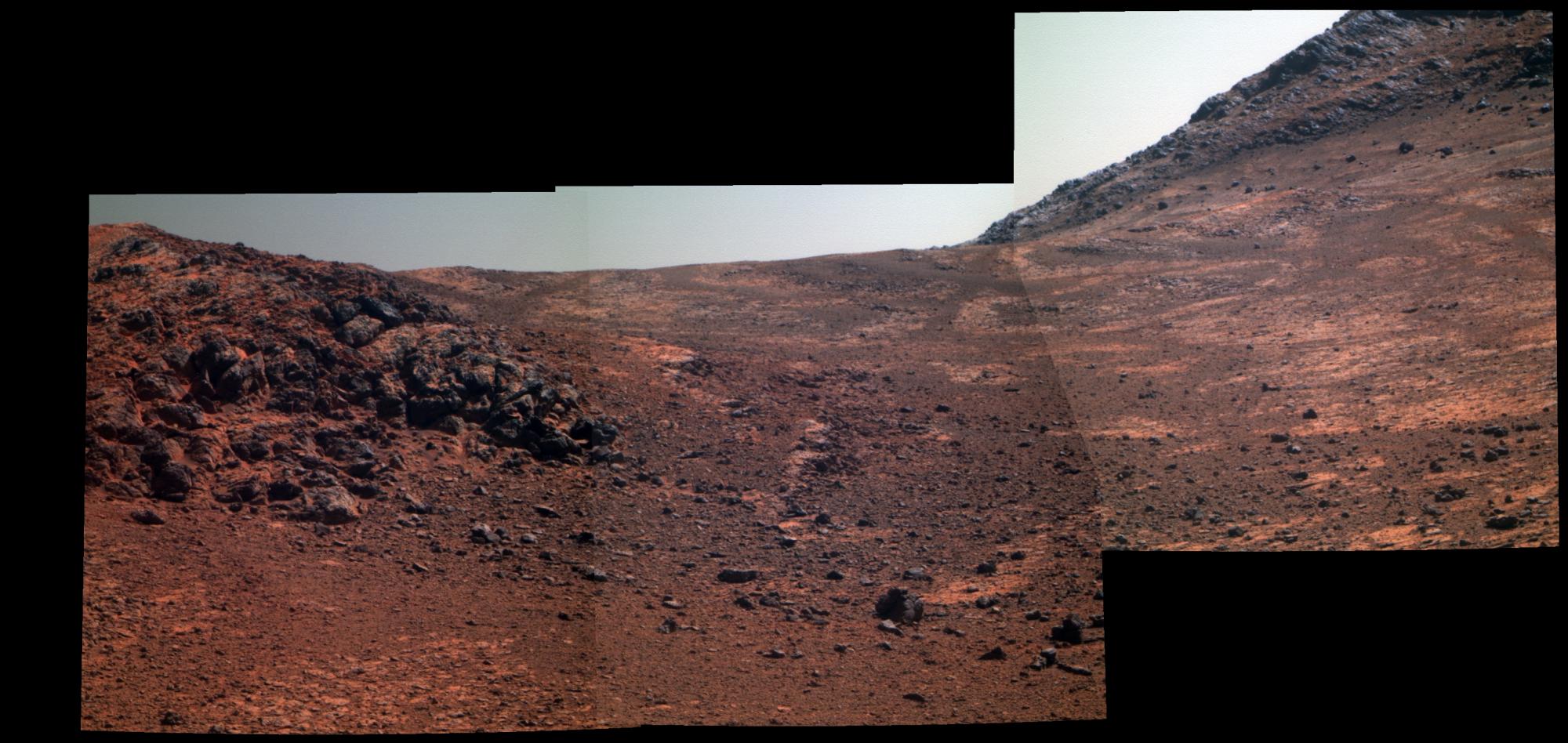 Color Pancam mosaic of the western valley. Opportunity will be leaving the valley in this direction at the end of the winter.