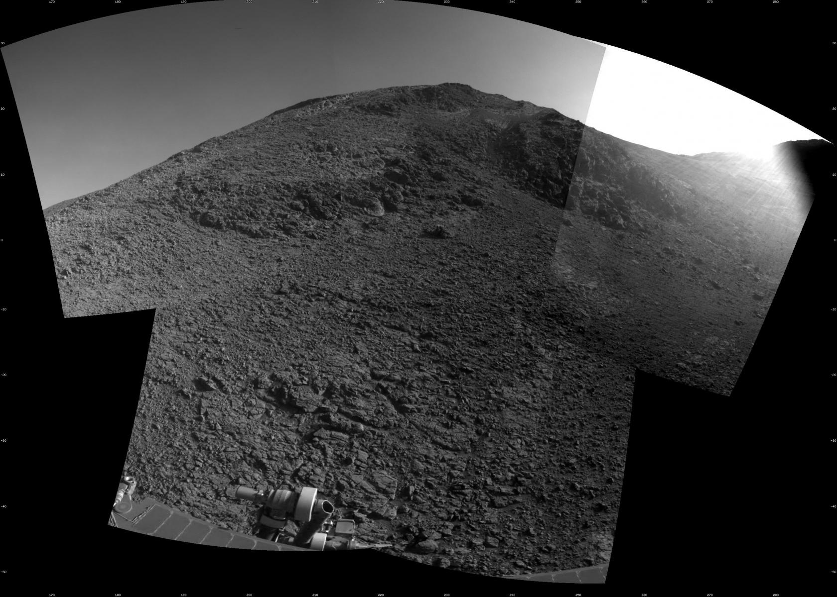 Above. View of Opportunity’s current position within Marathon Valley. We are currently headed west toward a prominent outcrop on the south valley wall. Opportunity is tilted more than 20 degrees north here on the valley wall, which is very good for winter power.