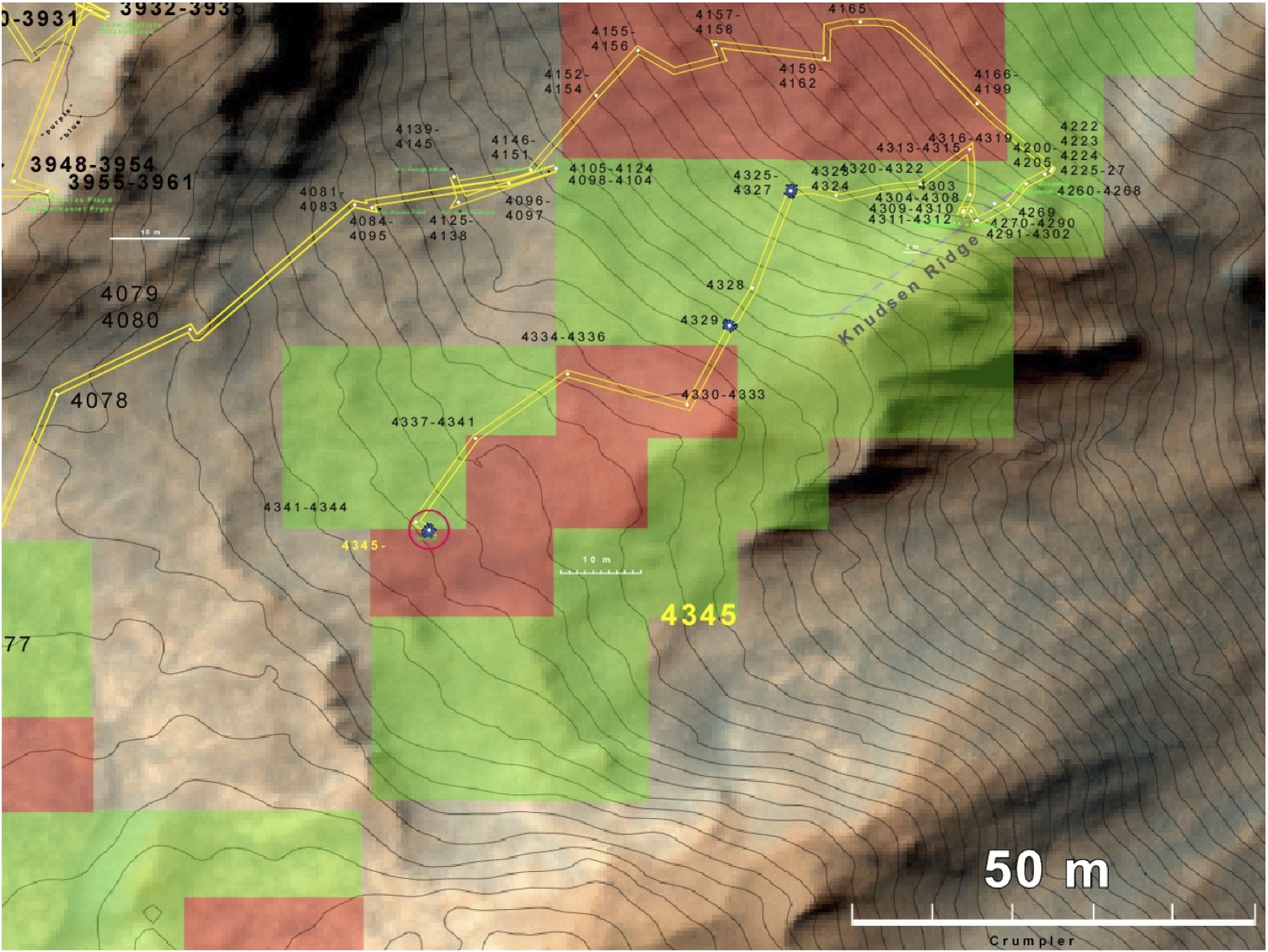 From orbit the areas shown in red above shows strong spectral signals of clay minerals. The green areas show the presence of clay, just not as strong. Opportunity's path follows the north side of the "red clay zone" and stopped at a series of stations to get Pancam overview mosaics before arriving at its current location just inside the red area. So this outcrop being examined right now is part of the presumed clay-rich area and we want to see what's so special about the rocks here. The contour intervals are 1 m and are based on analysis of stereo image pairs acquired by MRO/HiRISE, then overlain onone of the MRO/HiRISE images from the pair.