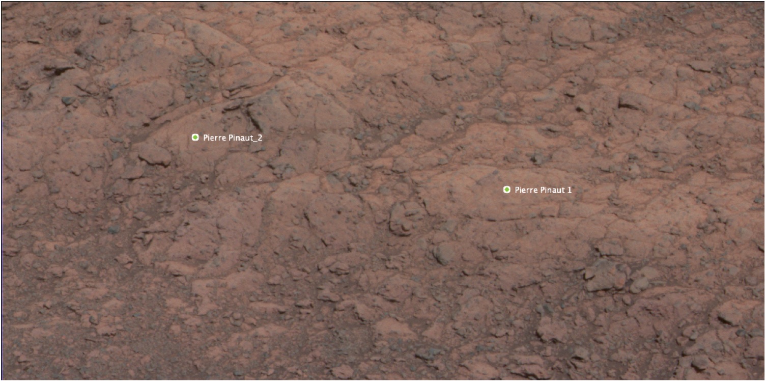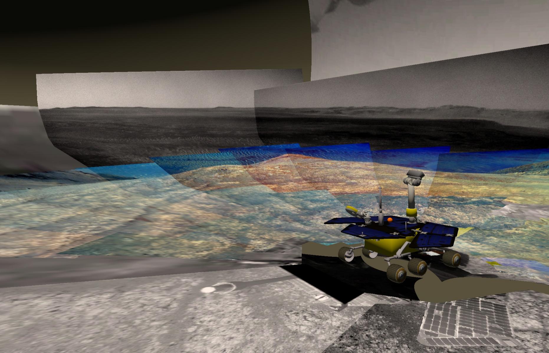 This shows the view looking from a position just west of Opportunity. The view covers the area of current Pancam and Navcam coverage from Opportunity and out to the east across Endeavour crater and 22 kilometers to the far rim. Opportunity has its instruments deployed onto the outcrop here. We are using a naming theme here that uses names of members of the Lewis and Clark Corp of Discovery. The current outcrop target is named Pierre Pinaut_3.