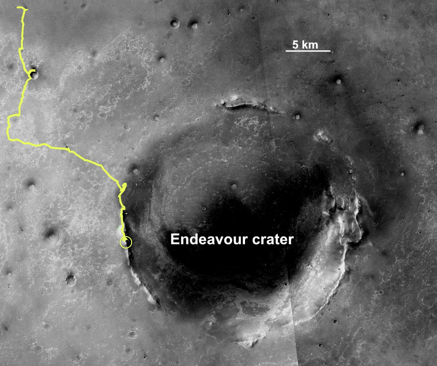 01. The current status of the 42-kilometer overall traverse from the landing site to Marathon Valley on the western rim of Endeavour impact crater. Opportunity has driven over 9 km along the rim of Endeavour crater since arival.