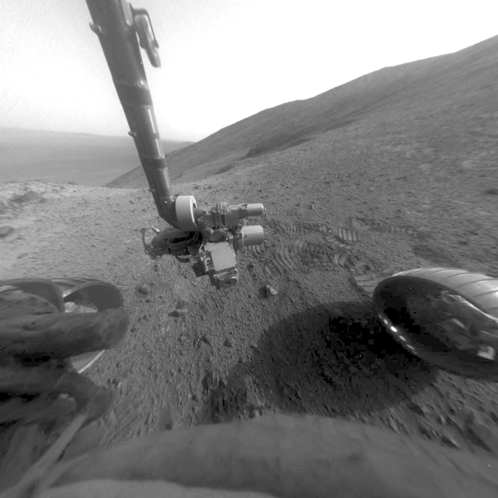 Opportunity has arrived at "Lewis and Clark Gap" with a new view to the south. It is about to leave Marathon Valley for good and head south into the next valley.  This marks the beginning of the current extended mission plan. At the end of the drive on sol 4482 Opportunity parked in a saddle between Knudsen and Wharton Ridges here on the west rim of Endeavour crater. Terrain is steep and there are places that we will continue to avoid in order to preserve drive options. It is easy to go down, but can be impossible to go back up slope if you are not careful. This is another planet and we are blazing a trail like Lewis and Clark.