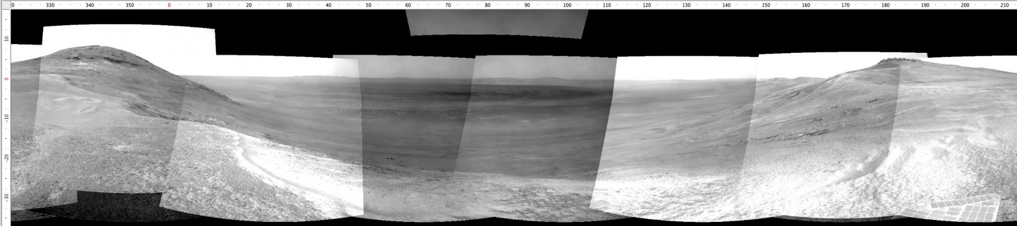 A short drive to the highest local point was done immediately after arrival and Opportunity has been working on a panorama from the overlook for the past couple of sols. The idea is to get a good overview of the valley from a high point before driving down it. But before we drive down the valley, we want to get a good sense of the geologic features here on the head of the valley. It could come in handy as we drive down the valley and may help us understand some things, particularly the lithology of any materials we find on the valley floor or at the terminus down near the crater floor. So we will be doing a short “walk-about” here on the outside of the crater rim near the “spillway” into the valley.