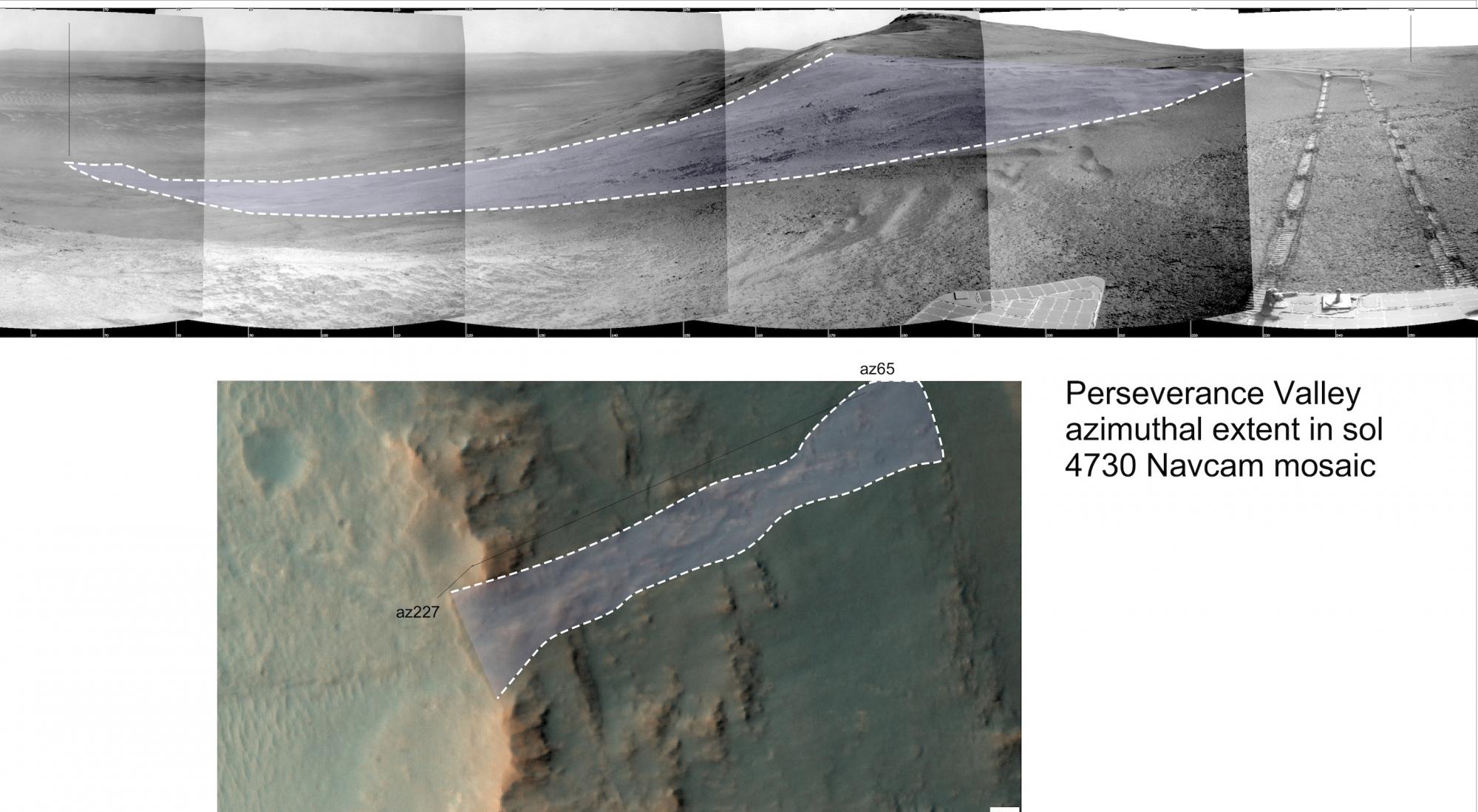 Above is an overview map showing the traverse southward along the rim of Endeavour crater and the arrival at the head of Perseverance Valley. For more information about the arrival, visit NASA's Planetary Phtojournal (https://photojournal.jpl.nasa.gov/catalog/PIA21496)