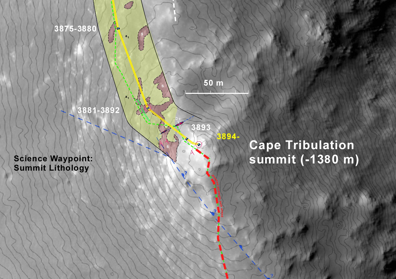 Wednesday, January 7, 2015 - 12:15pmOpportunity made it to the summit!! The view is spectacular. From here we can see all the way to the other side of the crater, we can see the rim looking north along the path to this location, and we can see far to the south, including another large impact crater that lies 10 km or so south of Endeavour.