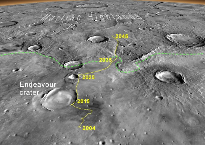 This map shows Opprtunity's total traverse since landing on Mars in january, 2004. AS of March 25, 2015, Opportunity has driven 42.195 kilometers across the surface of Mars. It also just fixed a flash memory problem.