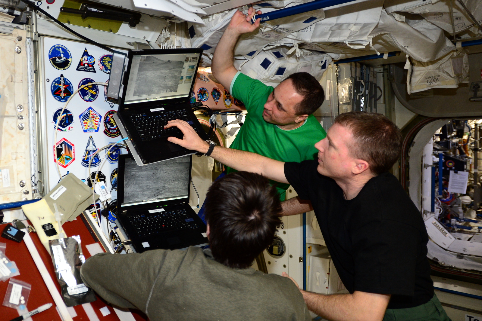 Above the ISS crew gathers around a couple of lap tops to view the Opportunity Navcam panorama shown above.