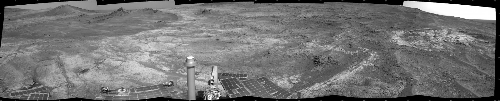 We are now at the entrance to Marathon Valley near an odd feature named "Spirit of Saint Louis" crater. This is one of the most alien scenes yet. And the geologic questions are numerous. What is the dark rubble pile of rocks? Are they older than the crater ejecta here? Why are they inside a large circle of dark soil and surrounded by bright outcrops? What are the bright outcrops? More ejecta or something else. We will be exploring many of these questions over the next couple of weeks.