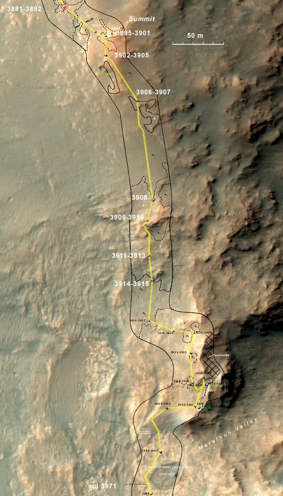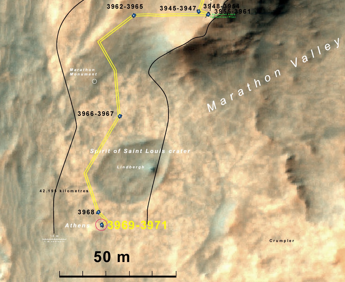 Opportunity wins a marathon. As Opportunity drove into Marathon Valley on sol 3968 (March 24) it exceeded 42.195 km of total traverse, or a marathon distance, since landing on Mars.