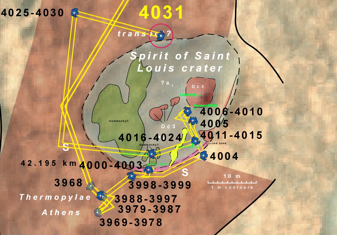Here is my current preliminary geologic map showing Opportunity's path to the north edge of Spirit of St.Louis crater. We are nearly done. And as soon as solar conjunction is over we will head east into the head of Marathon Valley.