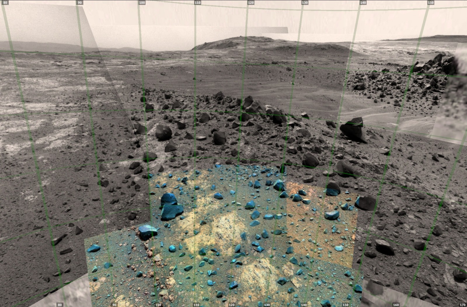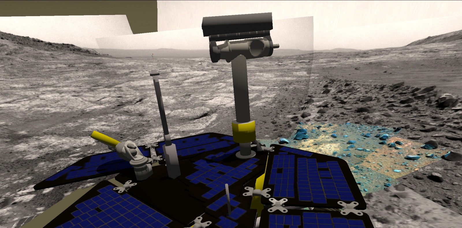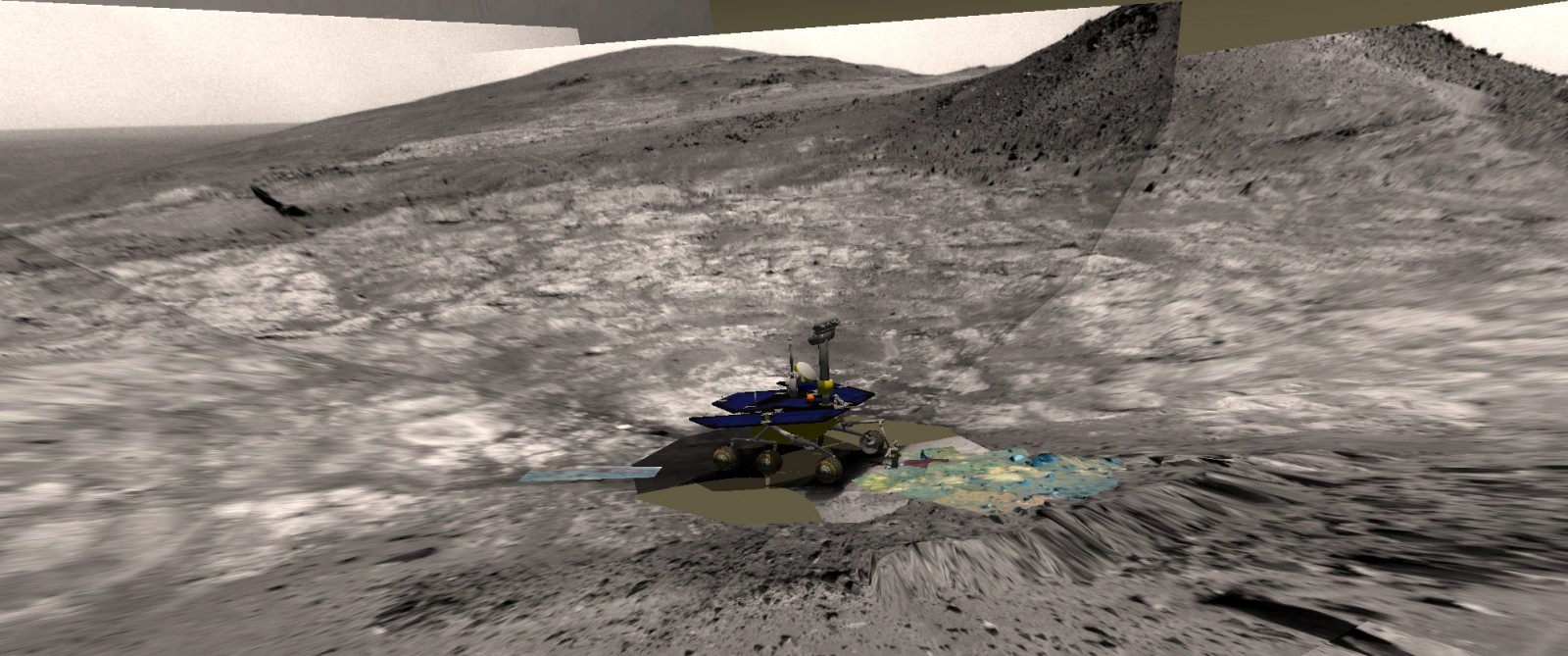 Above is a visualization of Opportunity using the Navcams from its current location to show what the surroundings look like. The colored area in front of the rover is the area that Opportunity is working on right now. It is sitting on the north edge of the odd Spirit of St. Louis crater finishing up investigating the crater. Over conjunction it will be working on a strange red-colored contact between the edge of the crater and the surrounding terrain.