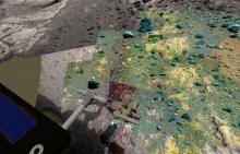 Opportunity has arrived at "Lewis and Clark Gap" with a new view to the south. It is about to leave Marathon Valley for good and head south into the next valley.  This marks the beginning of the current extended mission plan. At the end of the drive on sol 4482 Opportunity parked in a saddle between Knudsen and Wharton Ridges here on the west rim of Endeavour crater. Terrain is steep and there are places that we will continue to avoid in order to preserve drive options. It is easy to go down, but can be impossible to go back up slope if you are not careful.