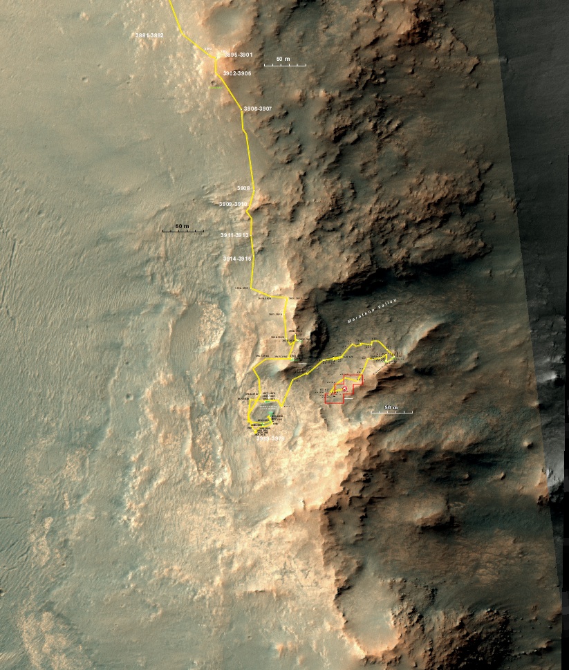 Opportunity is finishing up its activities here in Marathon Valley on the western rim of the 22 km-diameter Endeavour impact crater.  Over the past few weeks it has been “walking” along a ridge inspecting the outcrops. From orbit this location was spied as containing significant clay minerals, so the rocks here have been studied carefully.