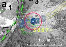 The various positions occupied by Opportunity as it works its way around several rock targets are shown on this overhead view of the local Navcam panoramas.
