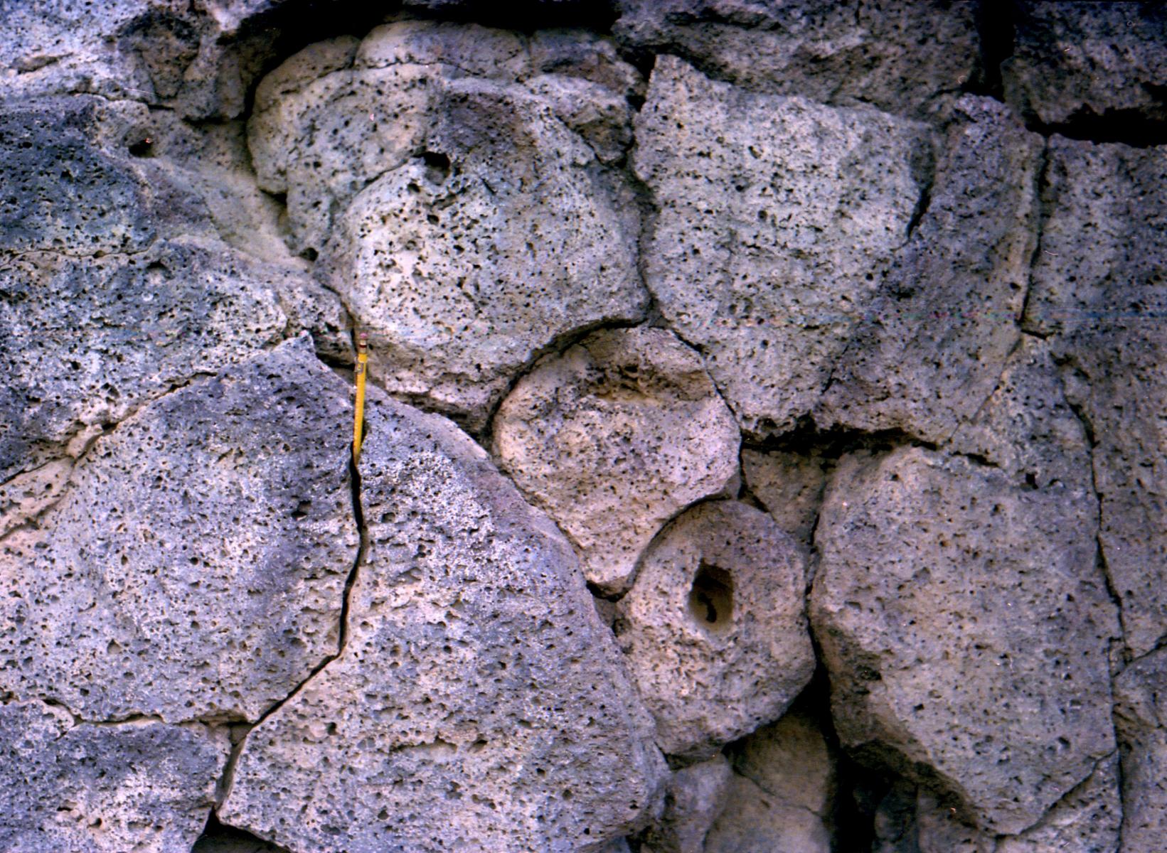 2. Just to the east of the white arrow at the trail side there are many white-coated rocks exposed in the trail. This is common in the Southwest. It is called caliche, and is formed by calcium carbonate, similar to the deposits left by hard water around your faucet. There are several hypotheses concerning caliche; it may be formed from ground water, deposited by surface rainfall, or may even be associated with the increased carbon dioxide associated with volcanism. Note that the basalt has many gas bubbles or “vesicles”. The vesicles are remnants of the gas (primarily carbon dioxide gas and water vapor) that is inherent in the magma and helps to drive the eruption. Throughout the traverse, note how the vesicle size and number change depending on the type of outcrop features. As you continue on the trail, look for the beginning of a lava flow associated with JA volcano. Lava flows are mostly to the east-west because the gradient at the time of eruption was toward the Rio Grande. As you continue to walk, you will climb up on the apron of small digitate (finger-like), radiating lava flows that form a platform around the base of the volcano. These are clearly visible in the air photo and were erupted on top of the first lava flow you saw on the trail.