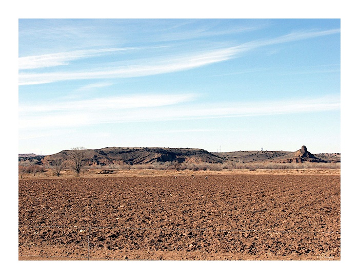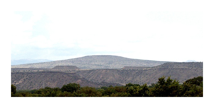 Canjilon Hill as seen from the highway near Bernalillo. From this angle it appears as a simple mesa. But actually it is a conical structural depression on an elevated platform that developed by erosion on the margins of the Rio Grande. Photo L. Crumpler
