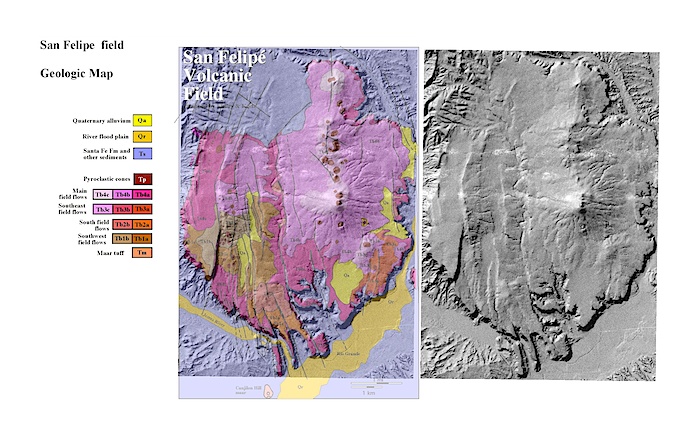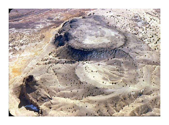 Canjilon Hill from the air is a partially dissected twin steam-blast explosion crater (maar) and represents the southern margin of the San Felipe field. It is one of the more unusual levels of exposure of a maar in the Southwest. Photo L. Crumpler